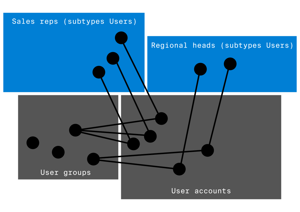 The following image illustrates the relationships between user group, user account, and user. User group and user are schematic topic types and thus solely in the responsibility and access of the administrator. These topic types are predefined. The administrator has to create one or more topic types of which instances will represent users in the domain. Our example has two domain topic types (sales rep and regional head) which instances may be connected to user accounts. They are subtypes of the predefined topic type User.